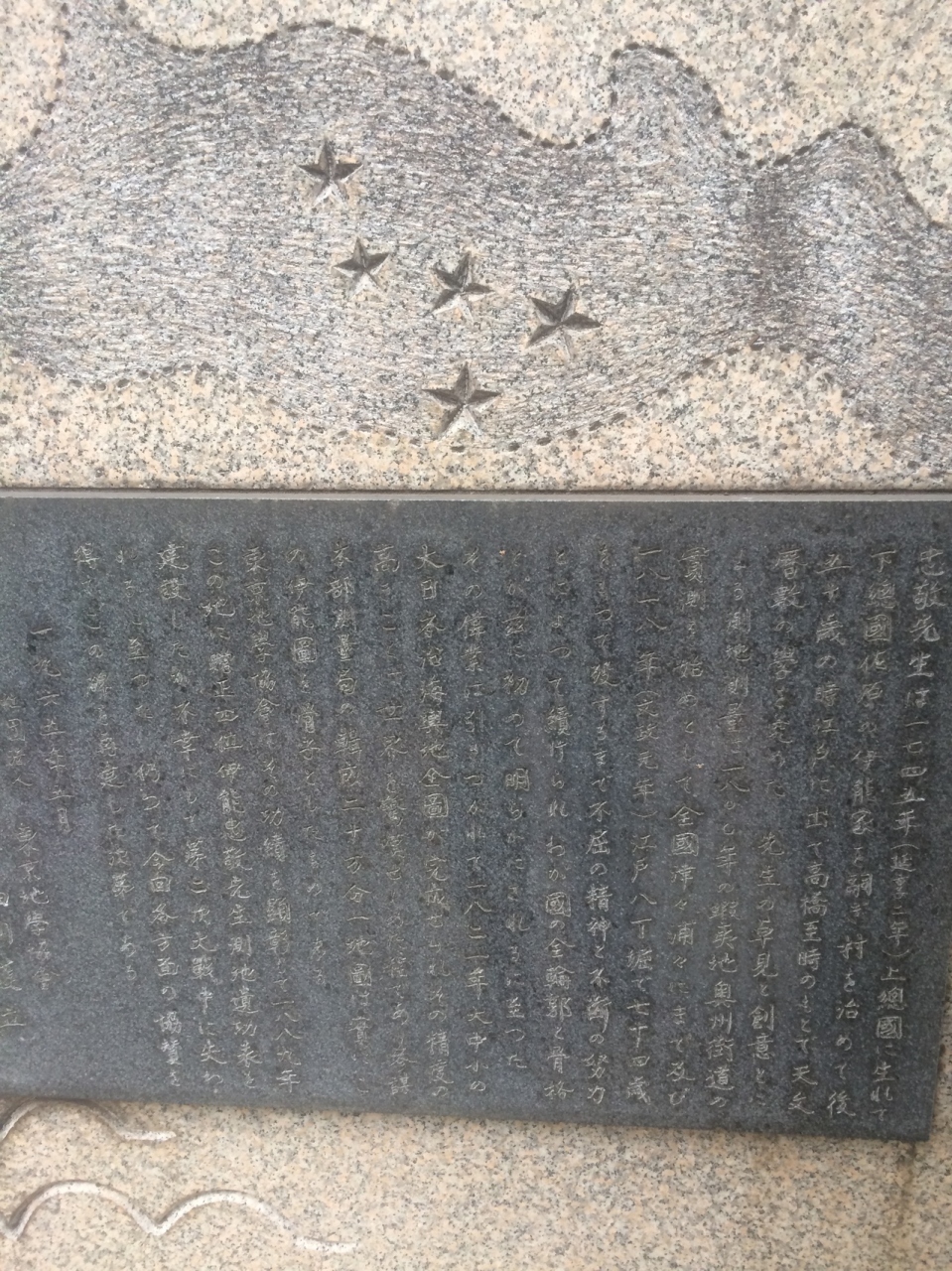 丸山古墳を登りると上にありました。目の前は広場のようになっていて後方は林となっていて、石碑には日本地図が描かれていて、地図上にいくつかの線が引かれてあったので伊能忠敬が測量で廻ったところを記しているのかも知れません。説明文もありましたが、文字があり小さく見づらかったです。