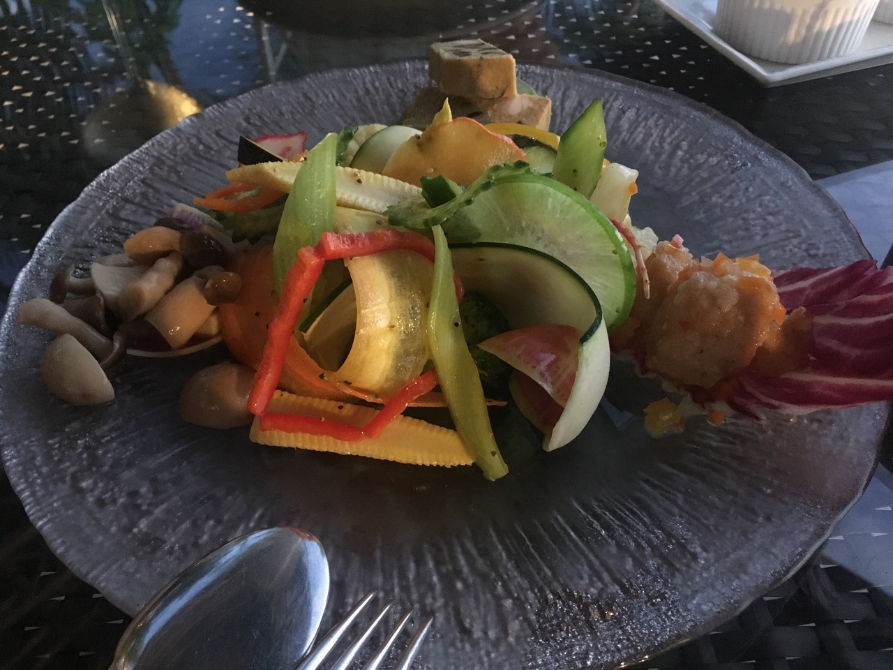 8月末で夜は暑苦しくはなく、屋外のテーブルでディナーをいただきました。オマールエビ、前菜などとても美味しかったです。ワインのボトルも3000円くらいのリーズナブルものからあるので、ありがたかったですね。