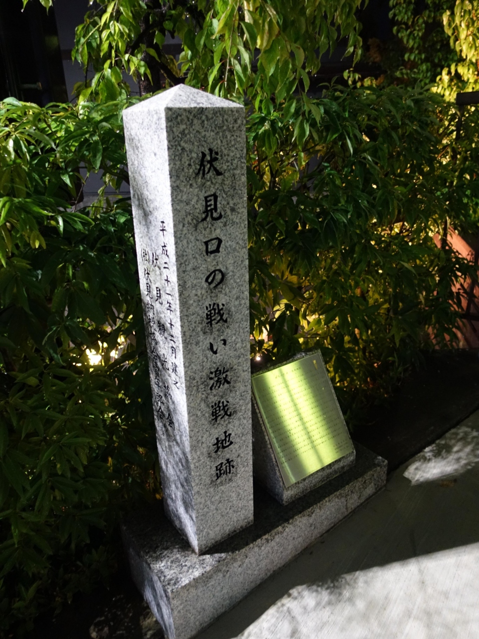 「伏見口の戦い激戦地跡」の石碑は寺田屋の近く、蓬莱橋のたもとにあります。最近設置されたと思われる新しい石碑で、趣はありません。