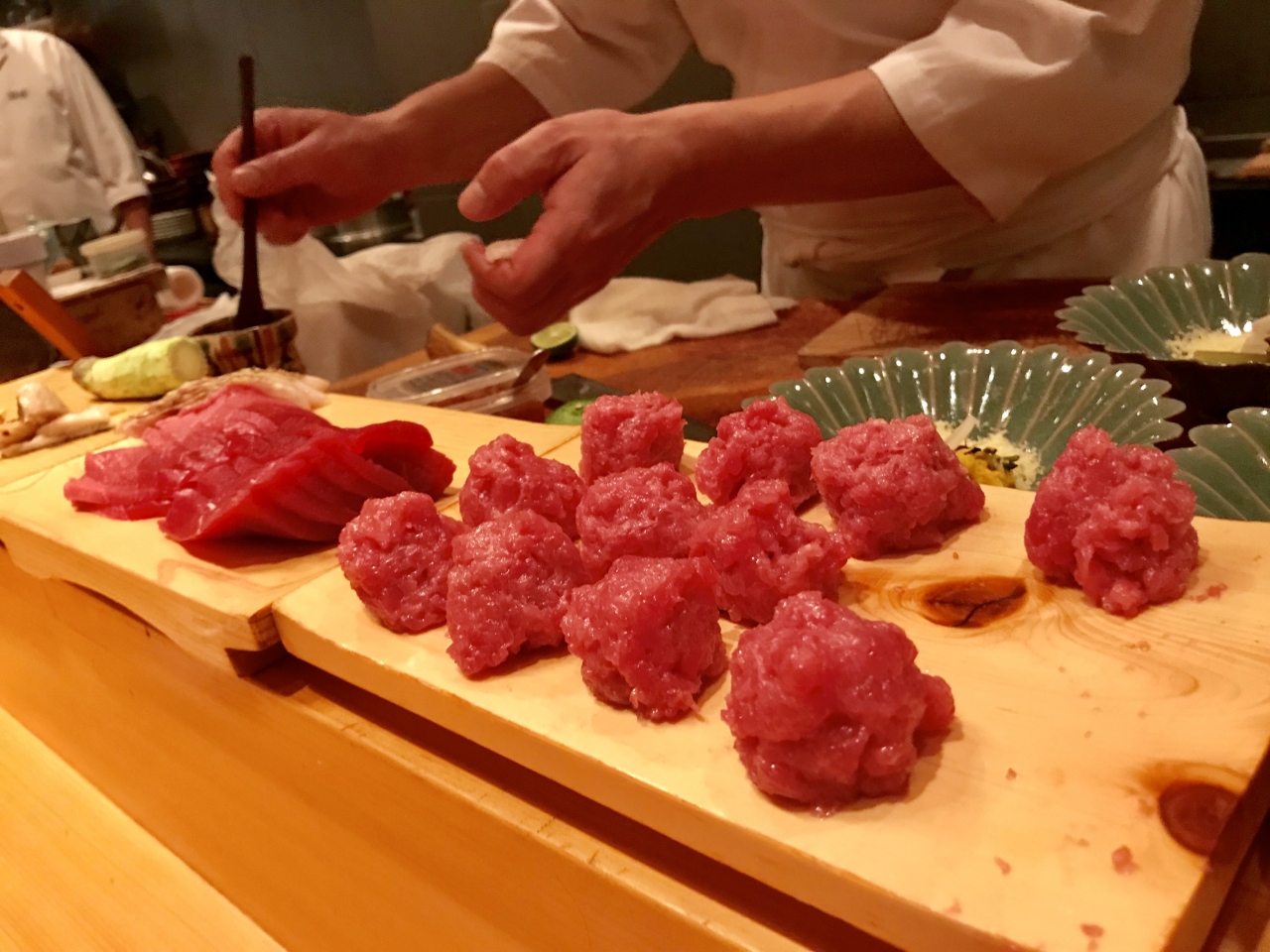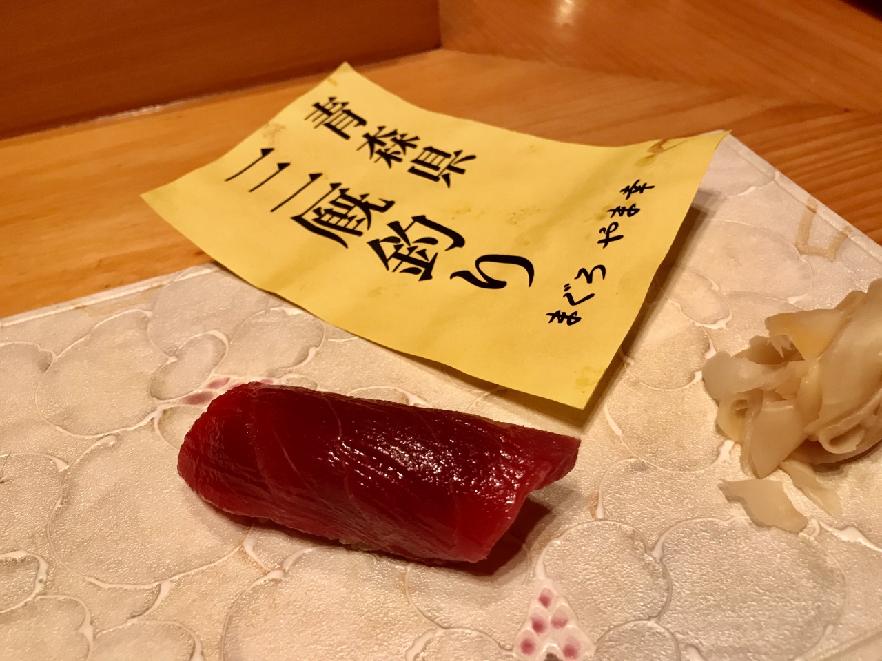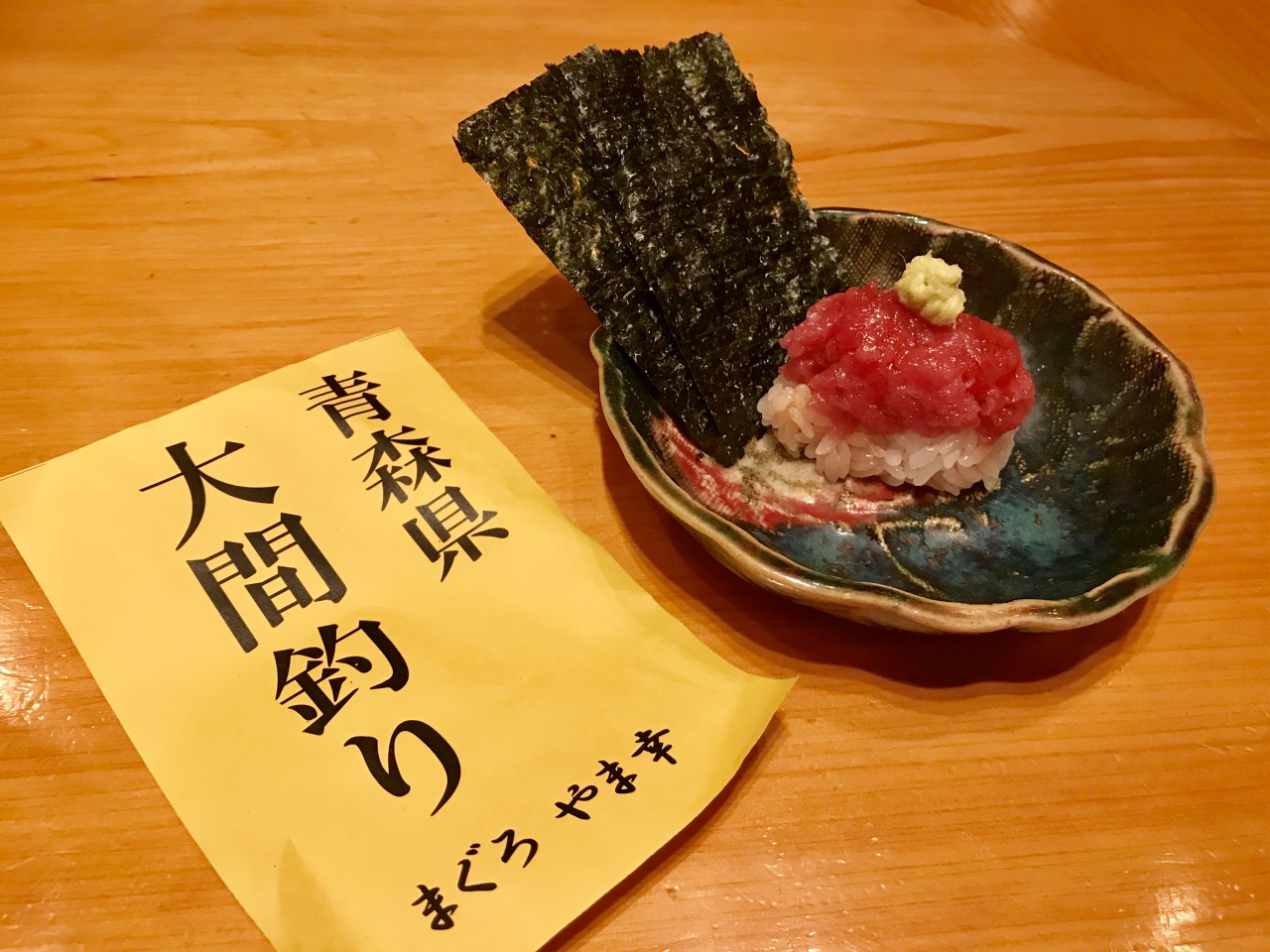 「大間の釣マグロ」酢飯の上に小さくたたかれたマグロを海苔で巻いて食す~美味い!