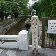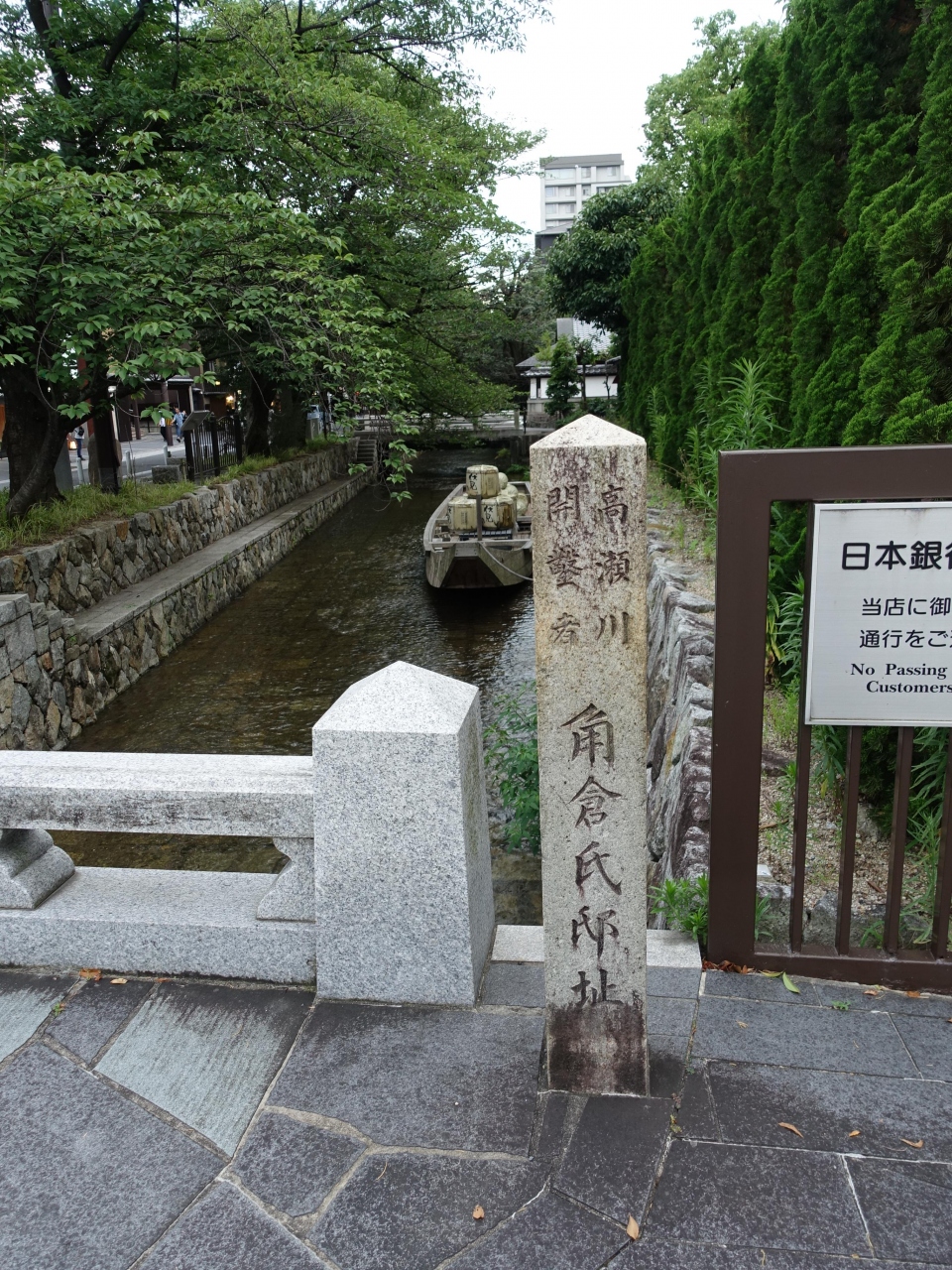 「高瀬川開鑿者 角倉氏邸址」の石碑は木屋町通りを南に下り、高瀬川に差し掛かるところに設置されています。すぐ近くには、「角倉了以 別邸址」の石碑もあり、京都の豪商の勢いの名残を感じます。かつての屋敷がどんなものだったのか、イラストのひとつでも残っているとより良いと思いますが…。