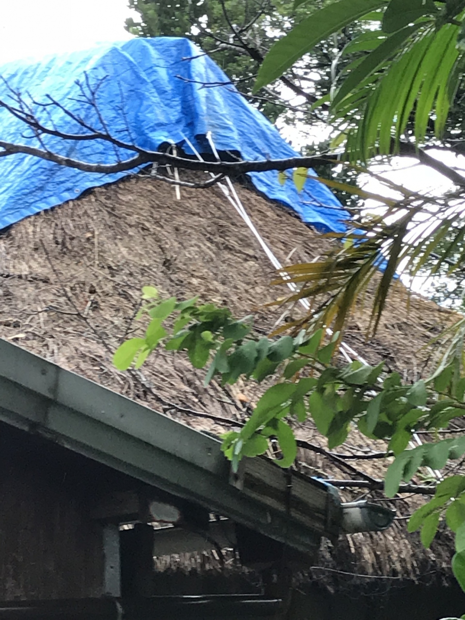 ひっそりと緑に囲まれた建物の屋根は補修中なのかブルーシートに覆われていました。