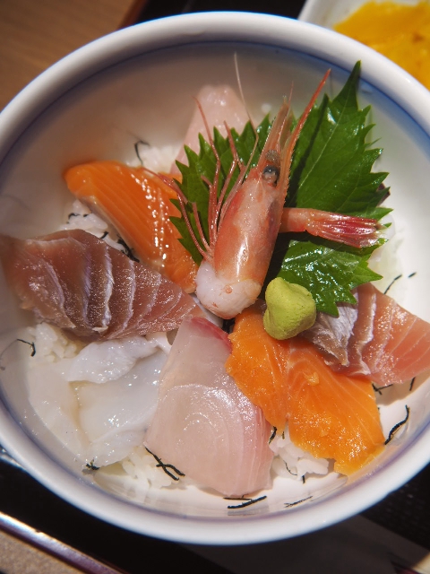 エビ、イカ、サーモン、ハマチ、カンパチ等の刺身が使われていた。