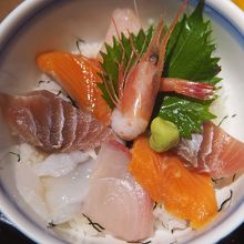 ご飯(コシヒカリ、となっている)の上に、様々な海鮮がトッピングされている。