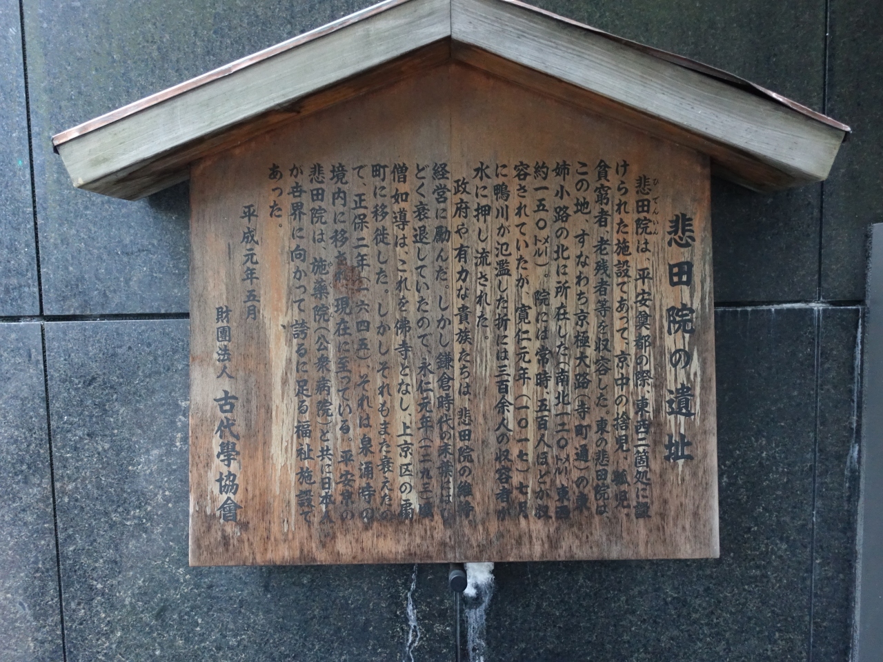 「悲田院の遺址」と記された木製案内板が、河原町通りのビルの壁面に設置されています。悲田院とは平安時代に孤児や捨子らを収容した施設のことのようです。