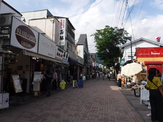 路線バスで白糸の滝を見に行った帰り軽井沢駅に戻る途中、旧軽井沢で降りてみました。ロータリーから細い道が延びて両側にお店が並び、平日でも観光客らしき人で溢れていました。てっきり歩行者天国かと思ったら、少ないながらも普通に車が通行していました。どちらかと言えばオシャレな店よりちょっと古めかしさのある店が多いですが、それも歴史ある旧軽井沢にぴったりです。目的のレースのお店で買い物した後、パン屋さんとかにも寄りたかったのですが、ゲリラ豪雨の警報が出たとかで早々にバスで駅まで戻りゆっくり散策できませんでした。軽井沢駅から少し遠いので、それが残念です。