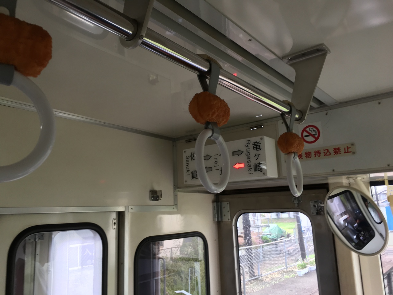コロッケの街 龍ヶ崎まで行く電車は、まいりゅう号です。車体には龍のイラストが描かれ目立ってますが、何気に車内を見渡すと吊り革には沢山のコロッケがぶら下がってます。