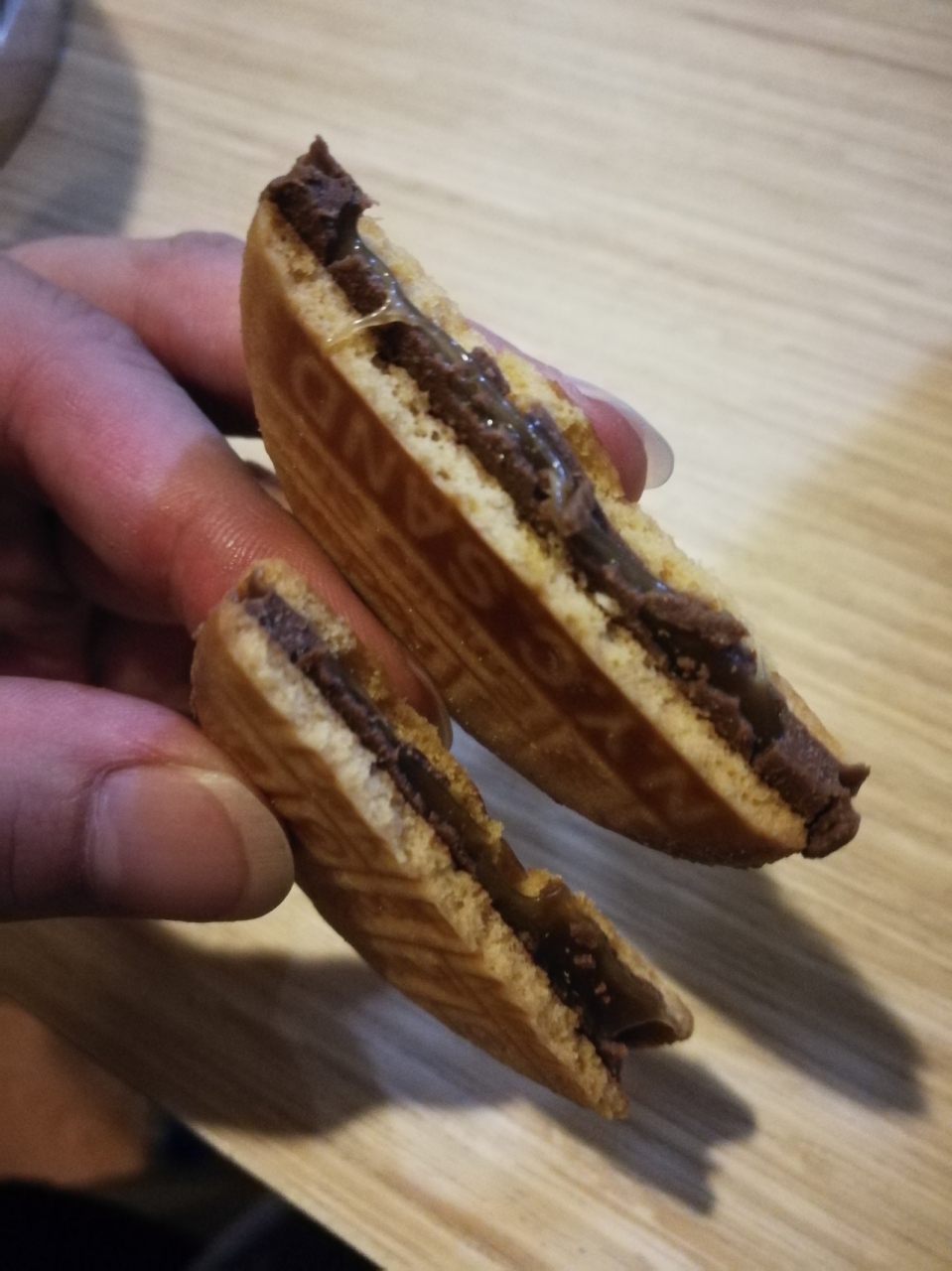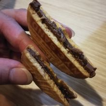 生地はサクサク、間にチョコレート、そのまた中にキャラメルが入っています。