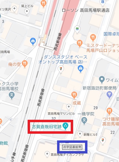 高田馬場駅の南側に志賀直哉の旧居跡の標識があります。点字図書館南の交差点の傍です。