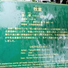 左手にクローバーを持ち、子牛に乗る少年の銅像です。