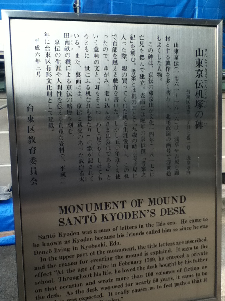 山東京伝机塚の碑は浅草神社裏の駐車場にある。石碑は上部の隅が丸味を帯びた直方体で、やや小さな文字が刻まれている。他に見ている人はいなかった。お勧めの点は、山東京伝は江戸時代後期の浮世絵師、戯作者であること、京伝の合巻は挿絵の面白さが魅力で人気があったこと、寛政の改革における出版統制により手鎖の処罰を受けたこと、このように山東京伝は江戸時代の有名な浮世絵師、戯作者であり特に浮世絵や劇作、江戸文化に関心のある人にとっては訪問する価値があることである。