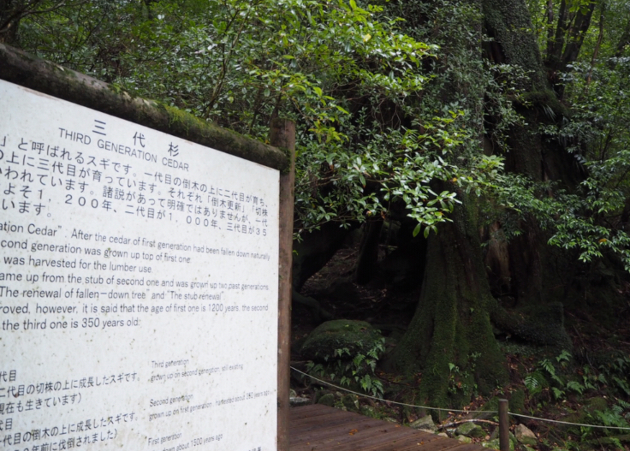 荒川登山口から縄文杉へのルートの途中、トロッコ道沿いにある屋久杉です。小杉谷山荘跡を過ぎてすぐの場所にあり、三代杉の看板がたてられていました。三代杉周辺のトロッコ道は両側が杉の木々にかこまれていて素敵な景色でした。