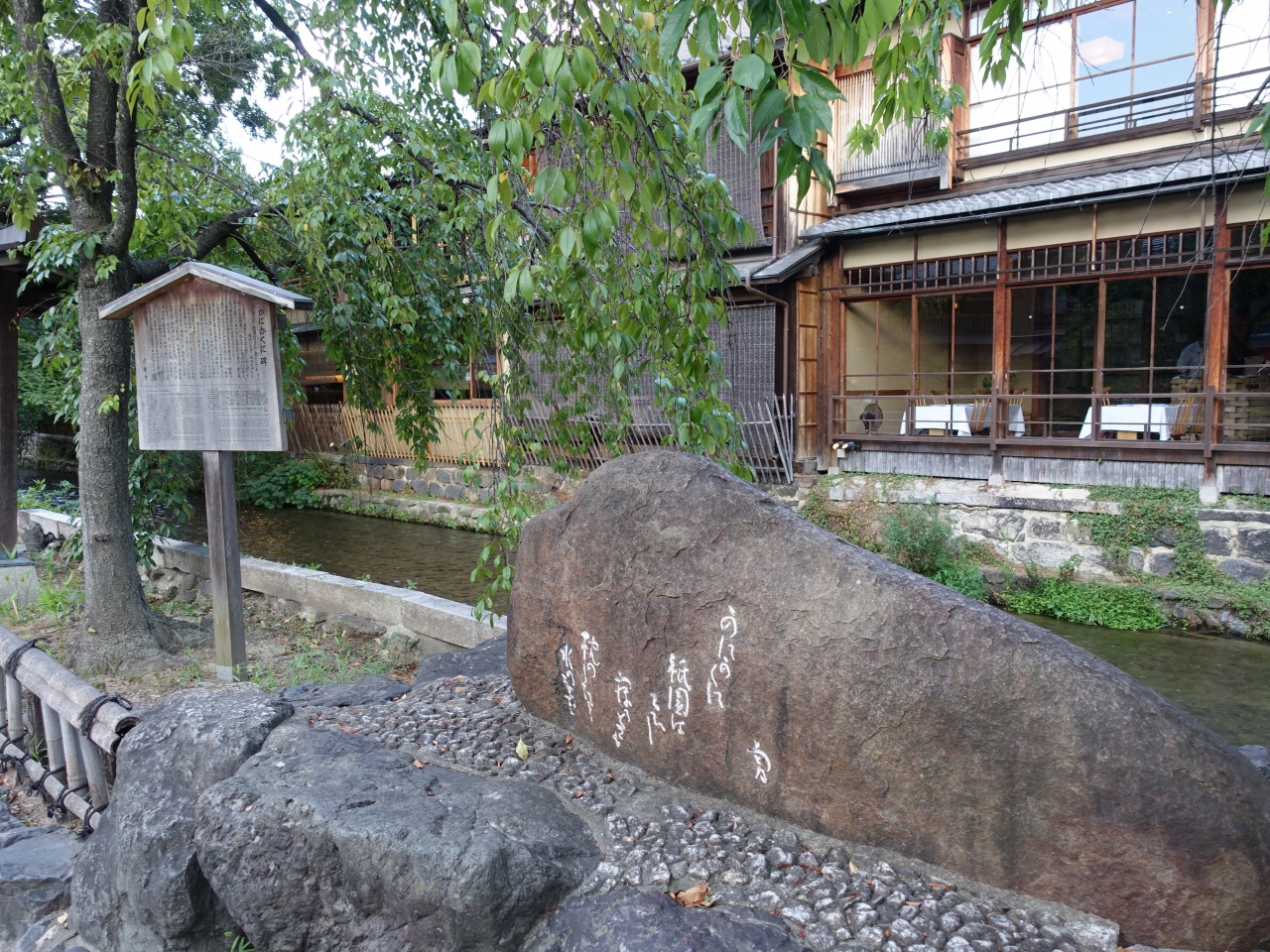 「かにかくに碑」は、京都の祇園エリアを流れる「白川」沿いにがあります。ずんぐりとした大きな石に、白い文字で吉井勇の詠んだ詩が記されています。以前足を運んだのは夜でライトアップされた姿でした。昼間の光景は、夜とは異なる趣があり、こちらもお奨めです。