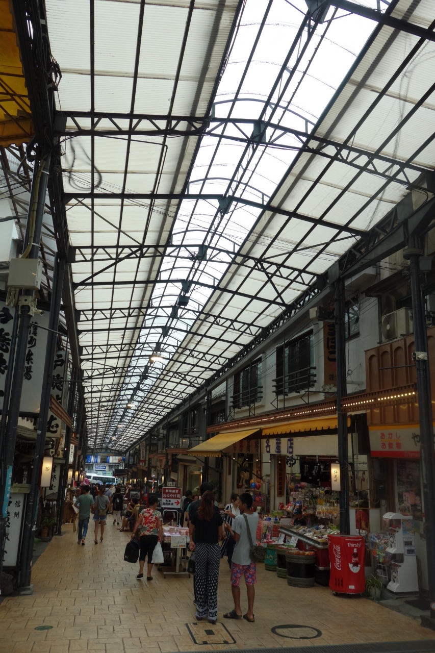 駅前広場から始まるアーケードの在る商店街です。観光地独特の俗っぽさが有り、レトロと言うか、懐かしい雰囲気がします。
