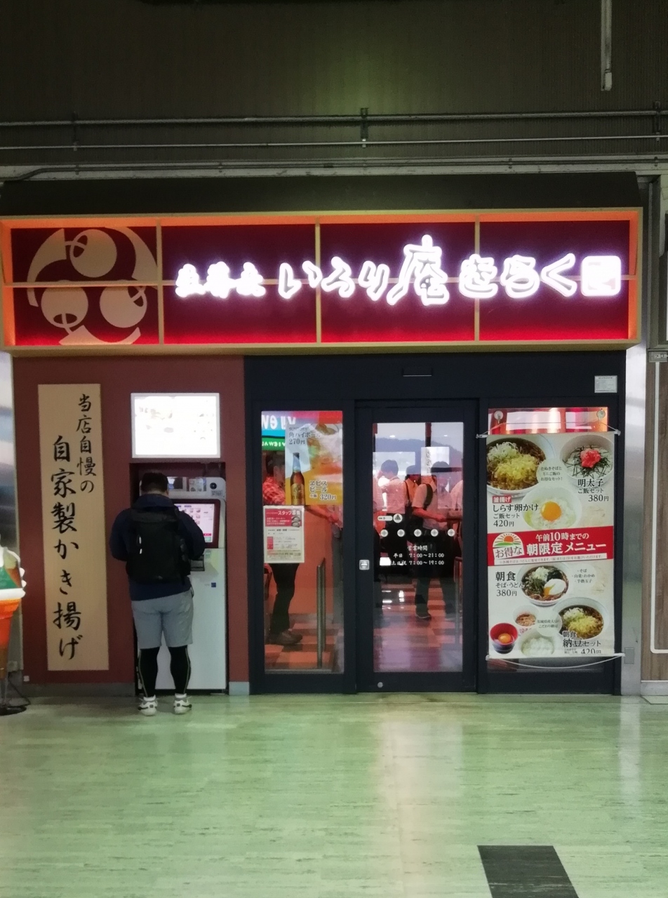JR府中本町駅の駅構内にある「きらく庵」です。最近はよく看板を見かけるようになりましたがココにもありました。オススメは、私の定番「たぬきそばとミニご飯」のセットで明太子ご飯。値段も380円とリーズナブルなので絶対お得、是非。