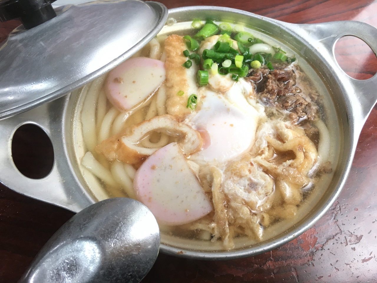 オープン前に並び名物の鍋焼きうどん(玉子入り)とおいなりさんを注文