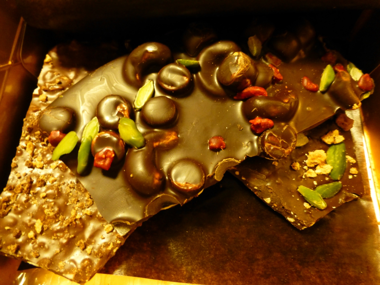利用したのは東京新宿の京王百貨店地下1階に入っているお店です。商品はナッツやドライフルーツ、マシュマロなどは入っている大きなピザのようなチョコレートです。ダークチョコレートがメインで、ミルクチョコレート、ホワイトチョコレートが1種類ずつあります。これらを割ったものの詰め合わせになります。グラム数により入れられる品数が変わります。また、季節限定商品もあります。今は秋ということでカボチャを使ったハロウィーンのチョコレートがありました。今回はナッツメインで3種類を選んで来ました。美味しかったです。