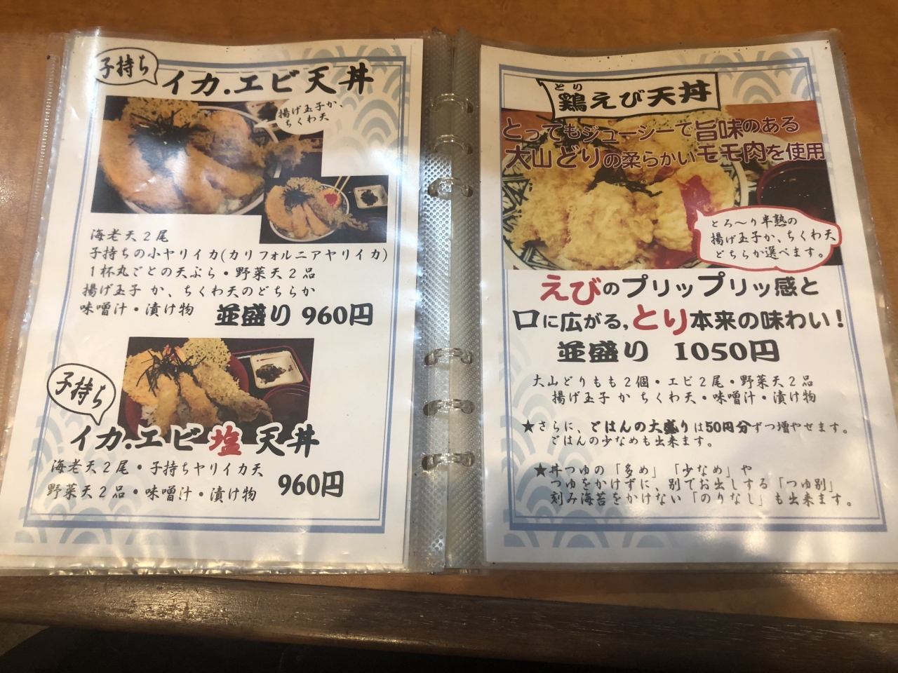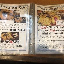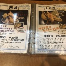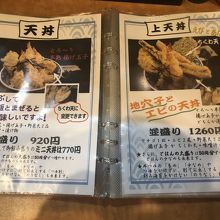 店内は、カウンターのみで、とても狭い。メニューは天丼のみだが、種類が多い。