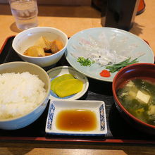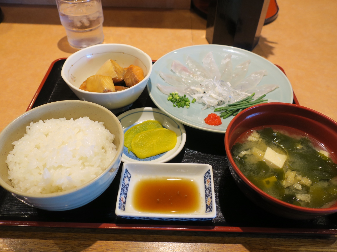 せっかくなのでふく定食を注文しました。食べ慣れていないのでふぐのおいしさはよくわからないのですが、値段はリーズナブルだし(1200円)、味噌汁や副菜の煮物等がおいしくて、来てよかったです。店の人たちはテキパキと働いていていかにも市場の食堂というかんじでいい雰囲気でした。