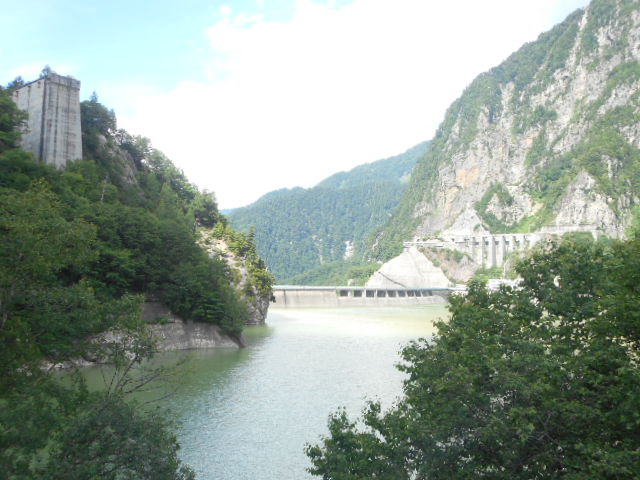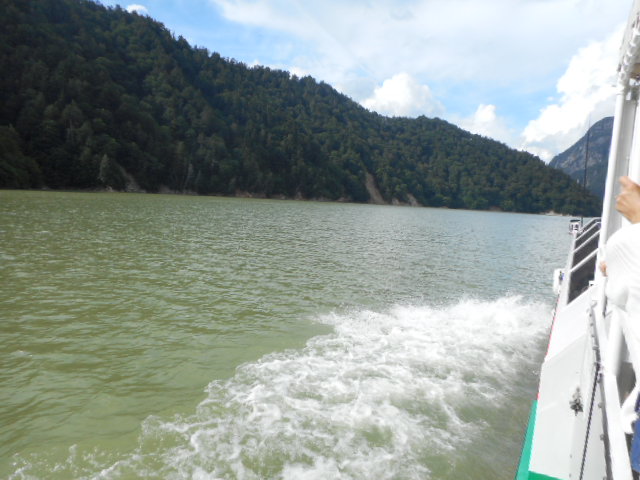立山黒部アルペンルートの観光でガルベという観光船に乗船しました。この船は黒部湖を湖内から観光できるものです。やく30分間黒部湖と周辺の山々を見学しました。日本で一番標高が高いところにある湖ということです。湖面は雨の後で少し濁り目立ったのが残念ですが、それでも景色はまあまあよかったです。