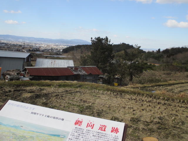 JR万葉まほろば線の巻向駅から山の辺の道に向かって歩いて、そのあたりの結構広い一帯が、この巻向遺跡になります。初期ヤマト発祥の地として有名な遺跡です。看板のある辺りが、少し高台になっているので、視界が広がって眺めがいいですよ。