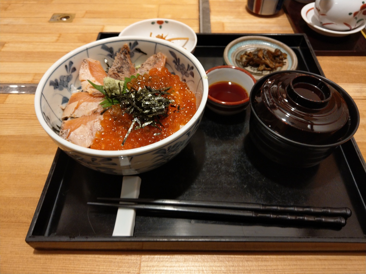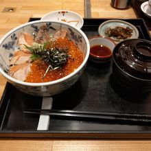 鮭イクラの親子丼をいただきました。鮭は新鮮で表面をあぶっていて美味しかったです。たっぷりのイクラも美味しいです。