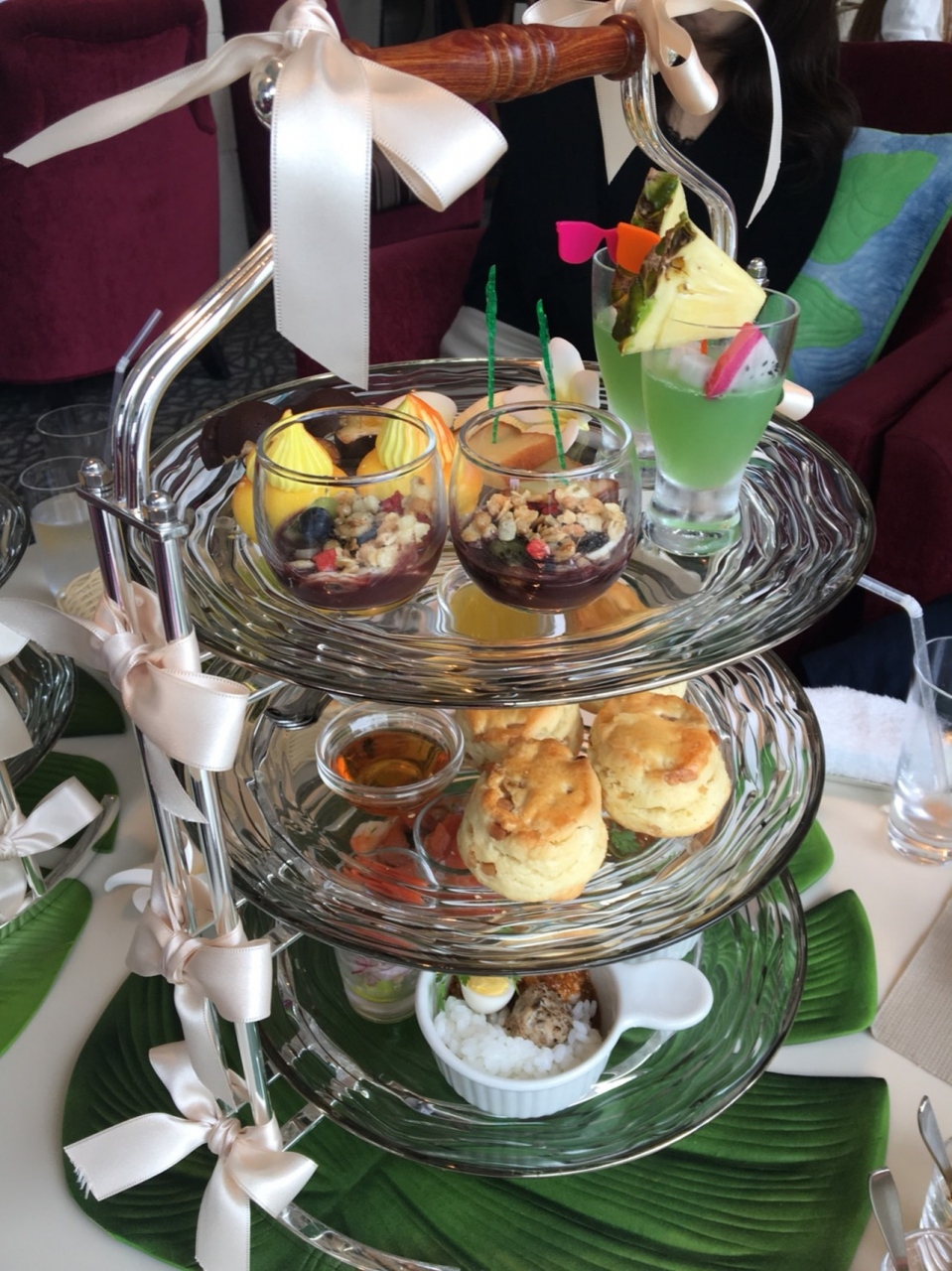 一度訪れてみたかったラスイート内にあるバーラウンジです。アフタヌーンティーで利用しました。ホテル内にはもう一つアフタヌーンが利用でいるレストランがあるようですが、そちらはいっぱいでした。わたしが利用した際はハワイアンがテーマだったので、テーブルセットがハワイアンテイストだったり、レイが用意されていたりと、楽しいアイデアのつまった内容でした。席もゆったりしており、お庭が見えて景色もよく贅沢な時間を過ごせます。