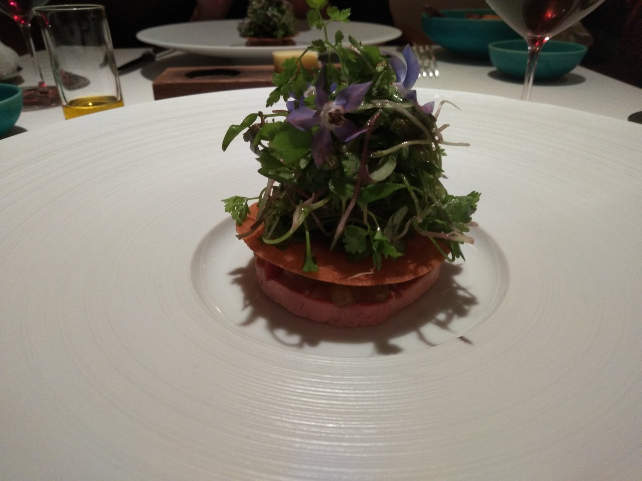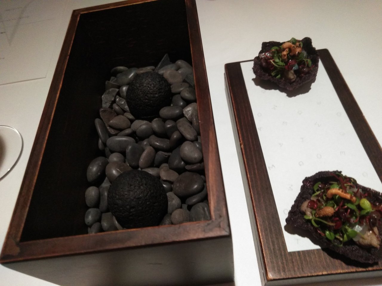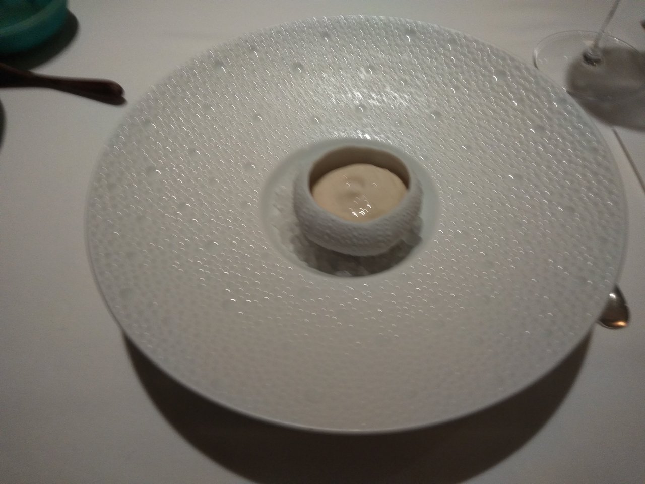 お店は階段上って2階がテーブル席、1階にはベルギーの大きな植木鉢に枯山水を催したデコレーション、塩かと思ったら砂、でした。料理の内容は凝った、和テイスト。よくあるちゃちなフュージョンフレンチではありません。男性客が多いのもうなずけます。見た事ない、食べた事のない味と食材の組み合わせにうなりました。感動の美味しさなので記念日に是非。でも、グラスワインが高くてビックリ。飲みたい人は予算2万円見ておきましょう。あゆ、アマダイ、うに、おこし、ケガニ、などを上手に組み合わせています。ダニエルキャスタンのフォアグラ、リムーザンこうし。と高級食材のオンパレード。〆の人形焼きのような焼き菓子は甘くなくて珍しい。写真を御覧ください。