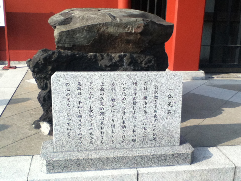 仏足石は浅草寺本堂の左側すぐの処にある。1877年増上寺僧侶により平和の願いを込めて奉納された。もともと上面に仏足が陰刻され、側面に由来が刻まれていたが、被災により上面の仏足は失われた。お勧めの点は、仏足石は釈迦の足跡を石に刻み信仰の対象としたもので紀元前からあったものであること、こちらの仏足石は残念ながら上面の仏足は見られないが、そのほかの部分は今でも残っており貴重なものであること、この仏足石を贈った増上寺僧侶や多くの人々のの平和を願う気持ちが感じられること、この仏足石は贈られた明治時代やその前後の信仰の様子を推測する上で貴重なものであり特に仏教学に関心のある人にとっては訪問する価値があることである。