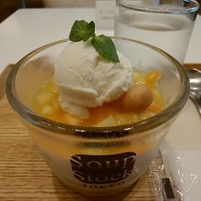 駅からすぐのたまプラーザテラスにある店舗です。「ココナッツプリンと4種のフルーツのチェ」500円(税込)です。一番底に、レンズ豆の優しい甘さの餡が入って、その上にココナッツプリン。フルーツのソースとアイスクリーム。