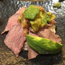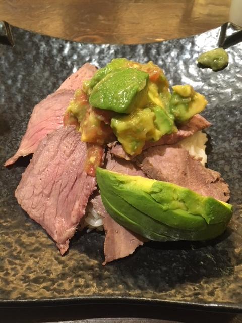 アボガドがたくさん入ったローストビーフ丼を注文しましたが、お肉はちょっとパサパサしていました。