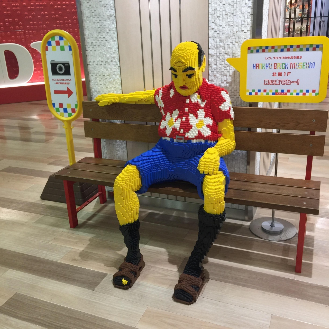 通りかかりに見つけたHANKYUBRICKMUSEUMの展示物です。ベンチに腰掛けてるおじさんの靴下に穴があいているるという小技が効いてます。三番街のはじっこのKIDDYLAND前の写真です。楽しいフォトスポットでした!