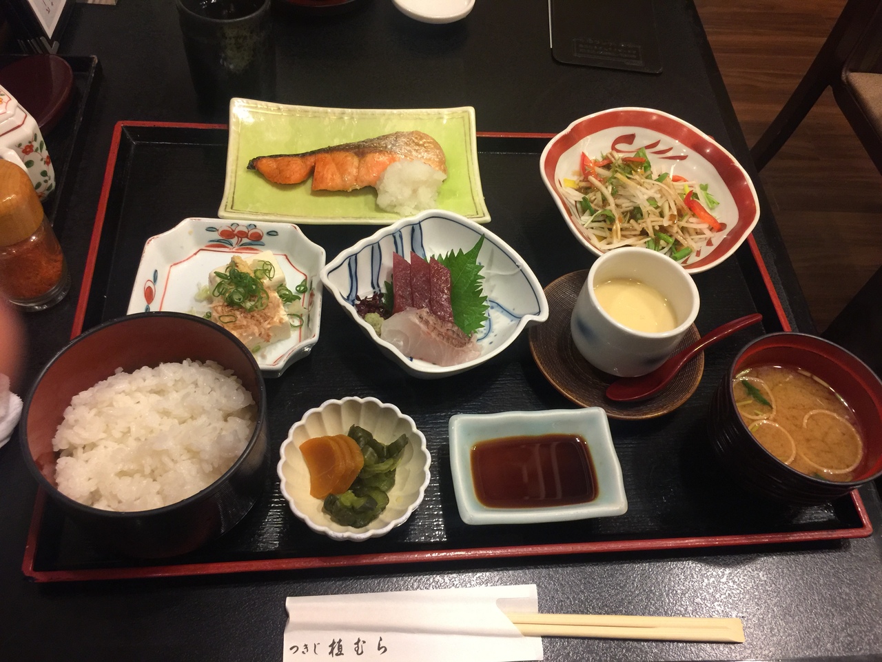 焼き鮭に刺身、、、茶碗蒸し、、、いろいろ付いてます。
