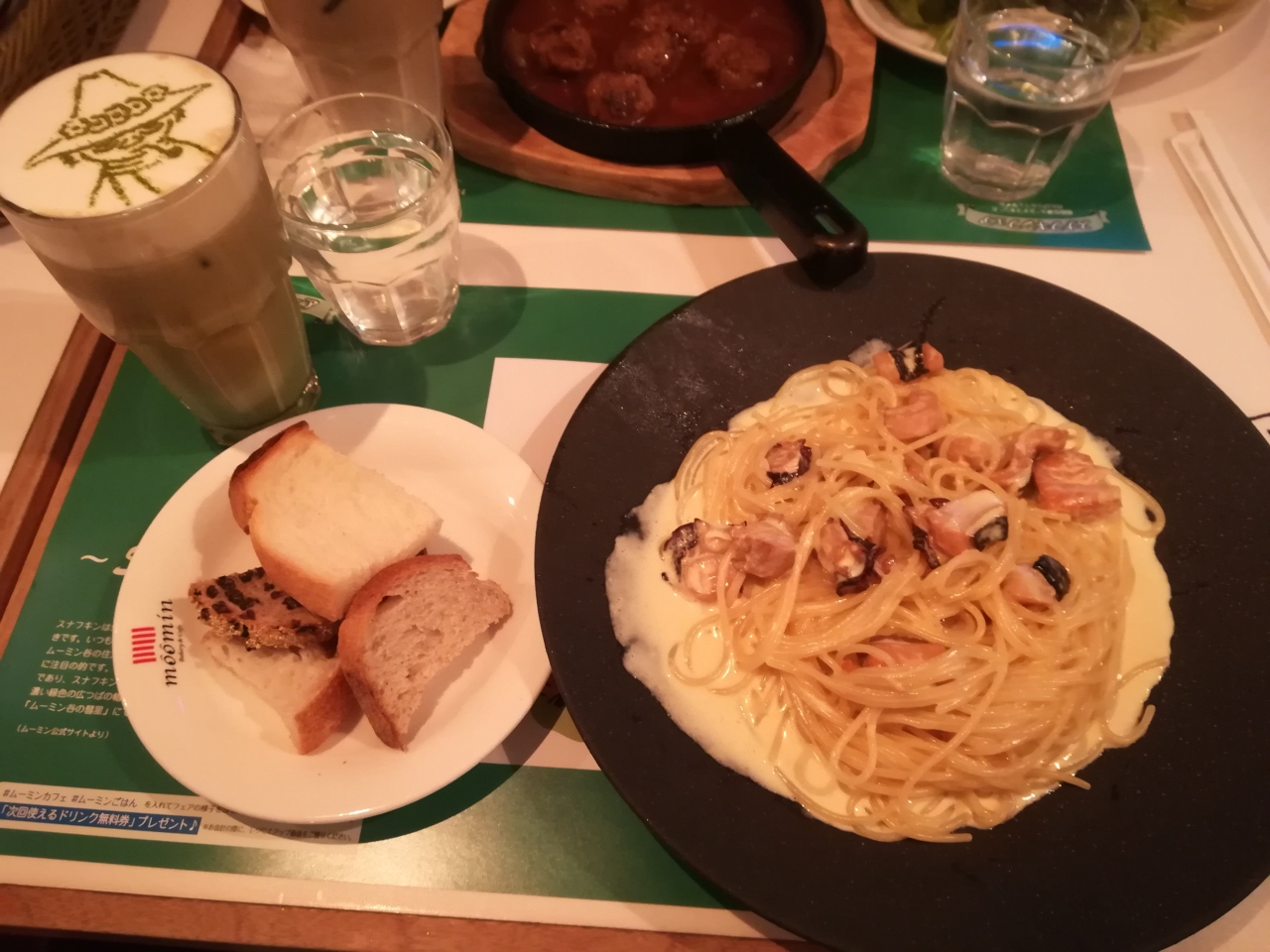 友人とディナーに行きました。店内にはムーミンのぬいぐるみが沢山いて、最初隣にスナフキンのぬいぐるみが座っていました。そのうち別のキャラに変わったりと、時々スタッフさんが動かしていました。ランチョンマットやコースター等もムーミン一色でした。
