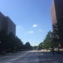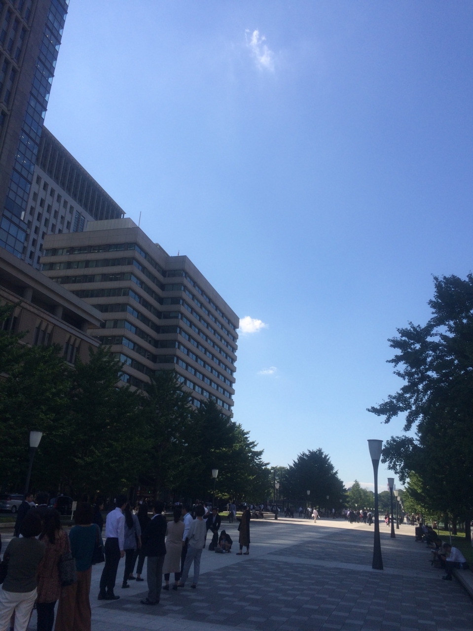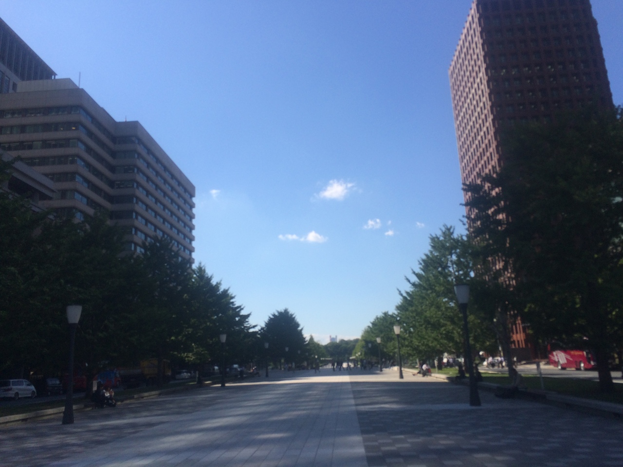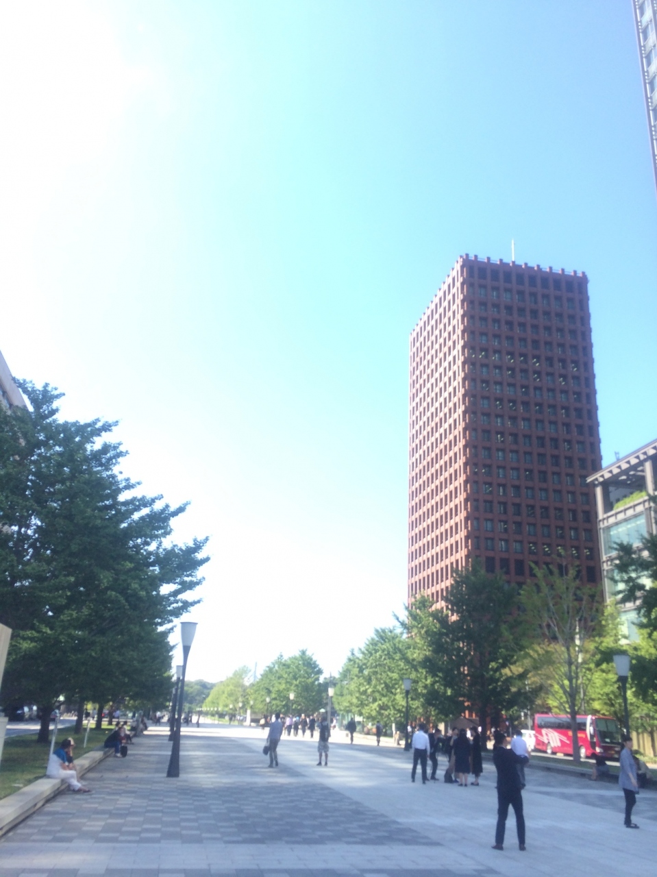 東京駅丸の内口付近から皇居へ伸びる道で、歩行者又は自転車専用の広い通りで、椅子も置いてあるので弁当を食べている人もいました。左右は自動車になっていて、境に木々が植えられ良い雰囲気。東京駅の写真を撮るスポットでもあるので観光客が外国人も多かったです。