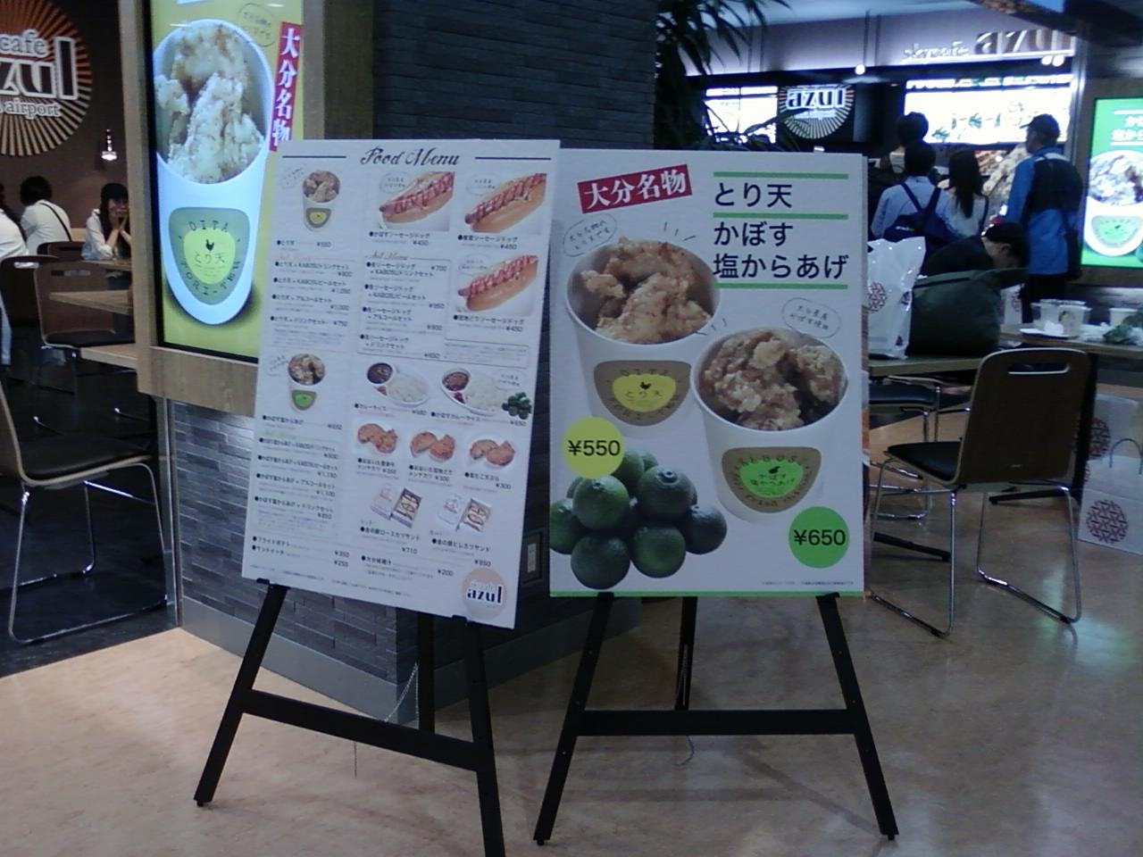 ここのスカイカフェ・アズールさんは、大分空港国内線ターミナル2階、出発ロビーにあります。このフロアにある唯一のカフェで、かなり人気。賑わっていました。さすがに大分空港のカフェらしく、大分とり天、かぼす塩からあげ、オリジナルかぼすビール、オリジナルかぼすドリンクなど、他のカフェでは見つかりそうもないようなメニューが並びます。比較的小ぶりな空港のカフェがこんなに充実していることも、食自慢の九州ならではの大きな魅力かもしれません。