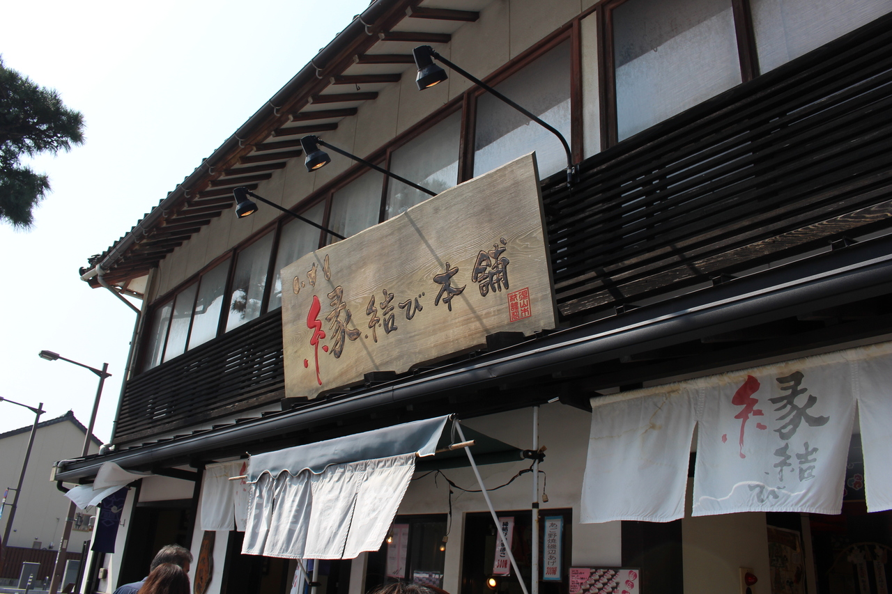 島根県の観光スポット、出雲大社近くにあるお店です。神門通り沿いにある縁結びグッツの専門店です。出雲大社は縁結びの神さまなのでこのようなお店がいくつかあります。かわいい縁結びの吊るしストラップなどいろいろありました。店頭では縁結びかまぼこが販売しています。
