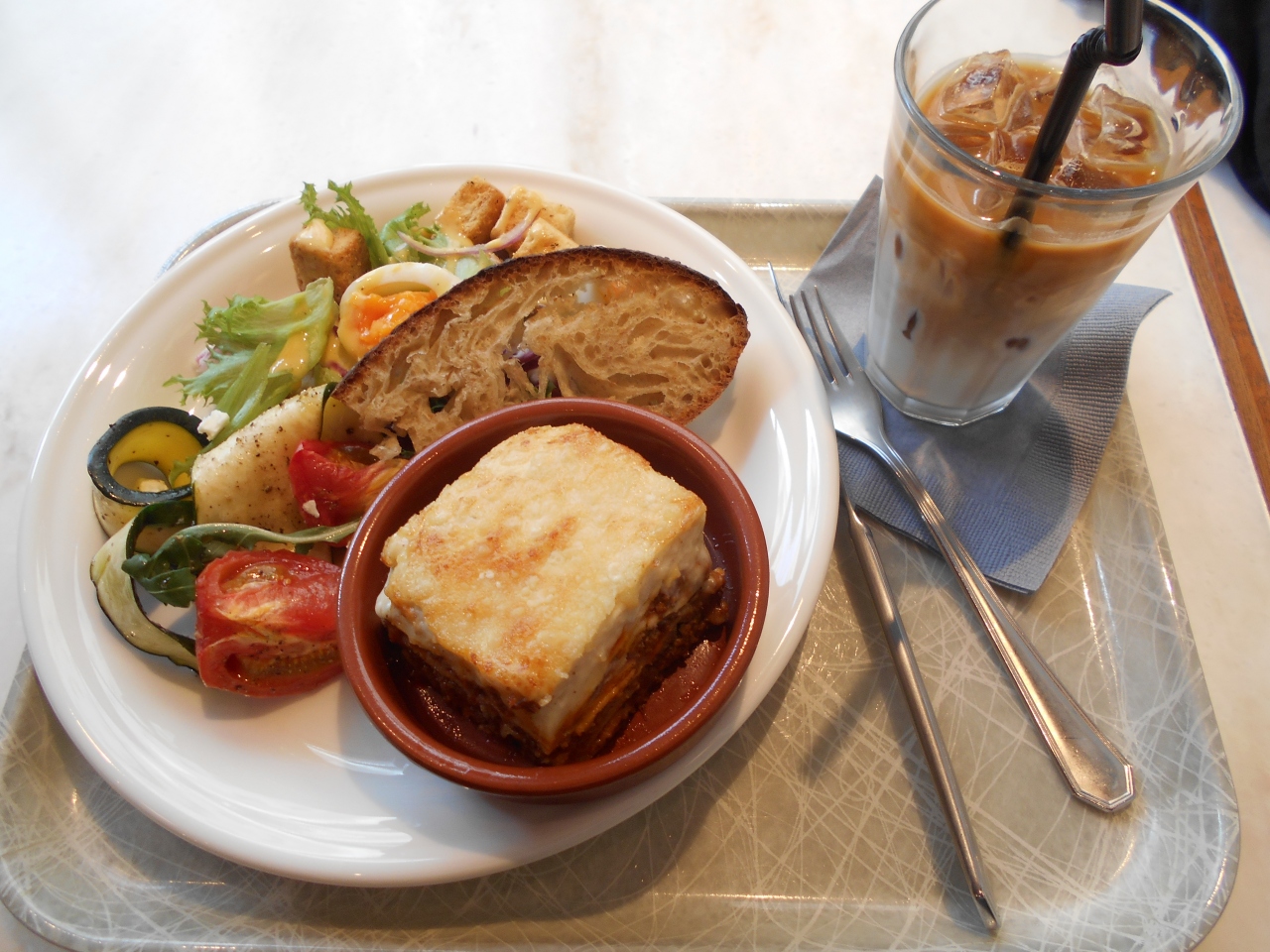 三条通りにあるカフェです。人気があり、行列ができていることも多いとか。平日に訪れました。この時はスムーズに入店できました。パンのコーナーとデリのコーナーがあります。デリでメインとサイドを選ぶセットを注文しました。メインはラザニア、キッシュなどがあり、迷いました。店内には本物の車を使った座席もありユニークでした。