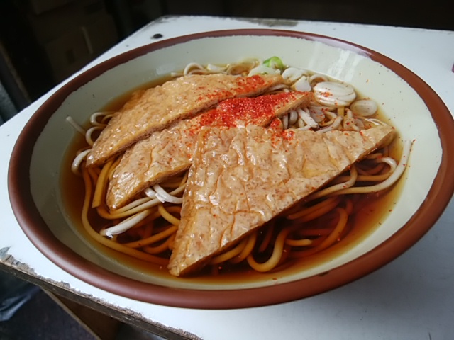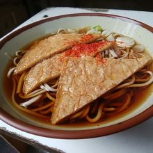 お揚げが3枚。太いぶわっとした食感のおそばです。
