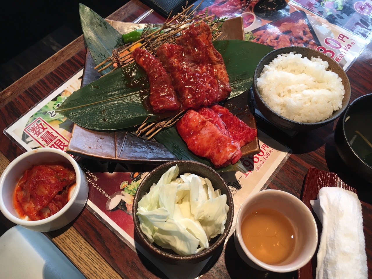 ランチで国産黒牛カルビ&厳選ハラミ定食を注文しました。写真のセットで、税込1700円ほどです。ごはんはおかわり自由です。タレは3種、塩ダレ・味噌ダレ・醤油ダレが用意されていました。