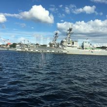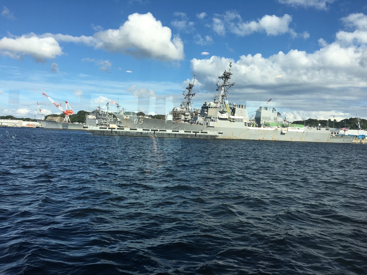 海軍やアメリカ軍の船が観れる軍港めぐり。世界情勢によって、船が出はらっていて少ない時があります。二回めだったのですが、今回は前より沢山の軍艦を見ることができました。二階席を狙いましたが、先に乗船した人たちがすでにたくさんいたので、中で見る一階席にしました。ガイドさんの話もよく見えて、一階でも楽しめました。