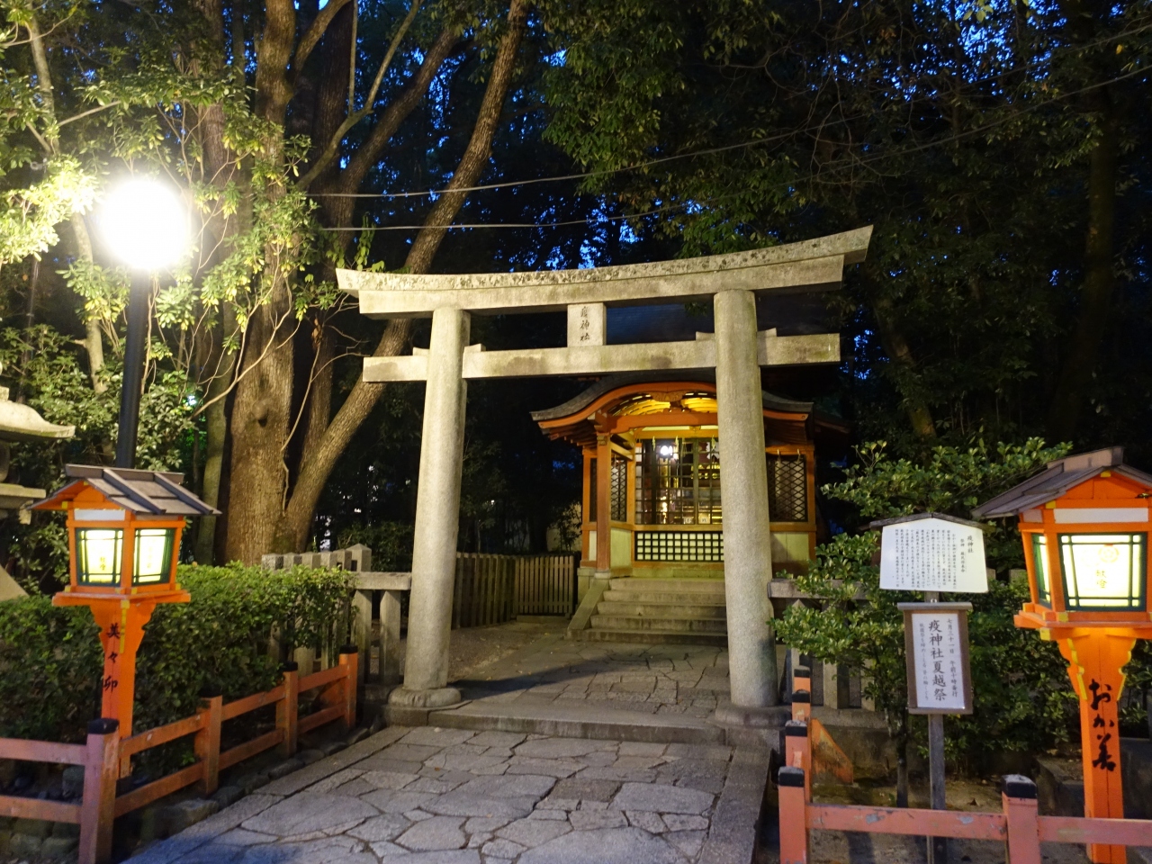 ここは、7月一カ月間にわたって行われる祇園祭の締めくくりとなる「夏越祭」が行われる場所です。鳥居脇に設置された案内板の下には「夏越祭」の開催を告げる案内がありました。
