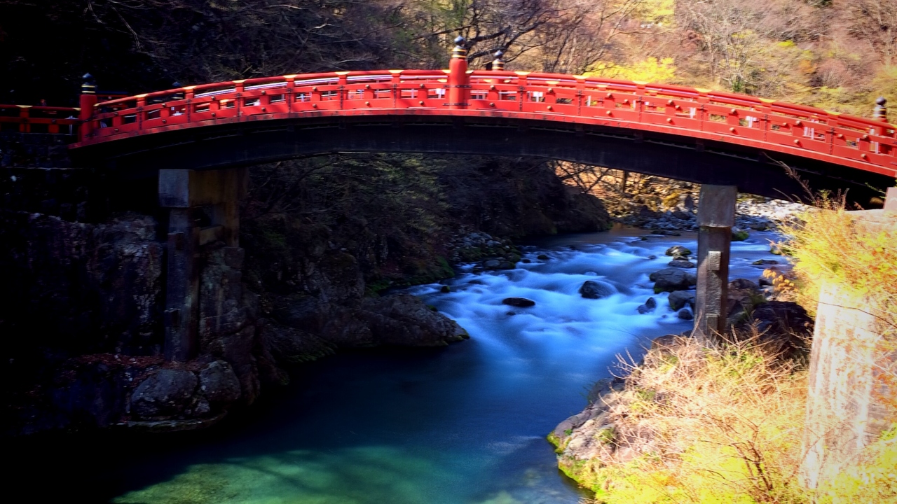日光二荒山神社への入り口にかかる『神橋』。赤く朱塗りされた木造橋。