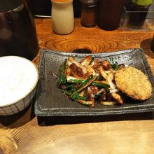 大阪駅前第3ビル地下2Fにある定食屋さんです。今回はホルモンスタミナ焼きに、150円のトッピングのメンチカツを。メンチカツはサクサクで味もあってソースなしでもおいしかったです。ホルモン焼きは野菜たっぷりでおいしかったです。