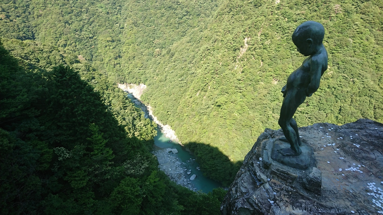徳島県西部の祖谷にある小便小僧の像です。結構急なところにたっています。昔、ここら辺の子供が度胸試しに崖から小便していたらしく、その像だそうです。ここに行くまでの道は狭く、運転に自信がない人はツアーなどで行く方がベターです。