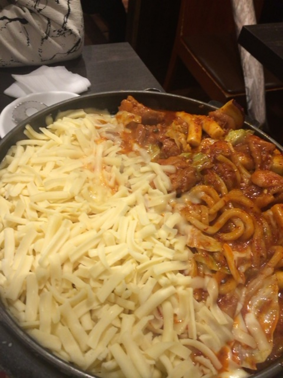 休日に夜ご飯を食べに行きました。今回はチーズタッカルビを目当てに行きました。テーブルで火を入れてくれるのでチーズがとろーっと溶ける様子を観察出来ます。少し辛いですがまろやかなチーズが上手くマッチしてとっても美味しかったです。次回はサムギョプサルを食べたいです。