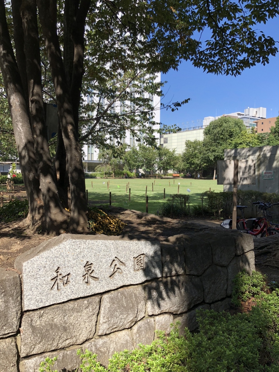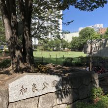 この辺りは会社も多く、高層の建物もあって、ビジネス街と言える場所だと思いますが、そんな中にある公園です。緑の芝生を中心に、その周りには木々が生い茂り、けっこう長閑な雰囲気でした、滑り台やブランコなどの遊戯施設もあるので、子供連れにも楽しめそうです。