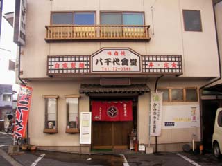 かみのやま温泉駅の駅前から商店が並ぶ通りに入って橋を渡ると天龍飯店と八千代食堂があり、自家製手打ちラーメンの店とのことで八千代食堂で遅いお昼を食べていきます。 店内に入るとテーブル席が並んでいて、みそラーメンを注文し、地元の新聞を読んでしばらく待つと、 野菜が沢山乗っているみそラーメンが出来上がり、漬物がついています。普通盛りですが、量が多くて体が暖まり満腹になりました。