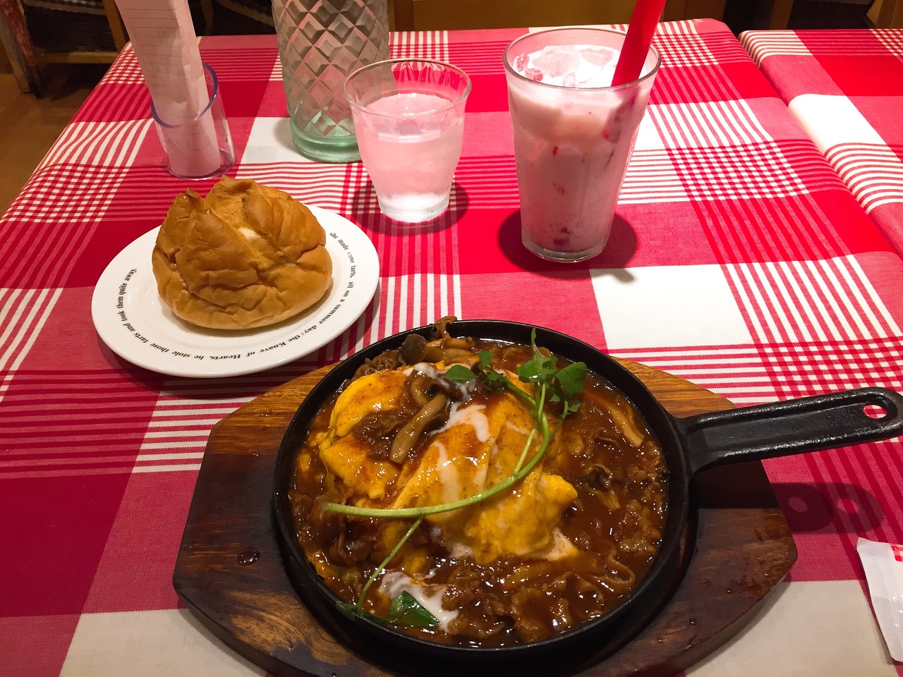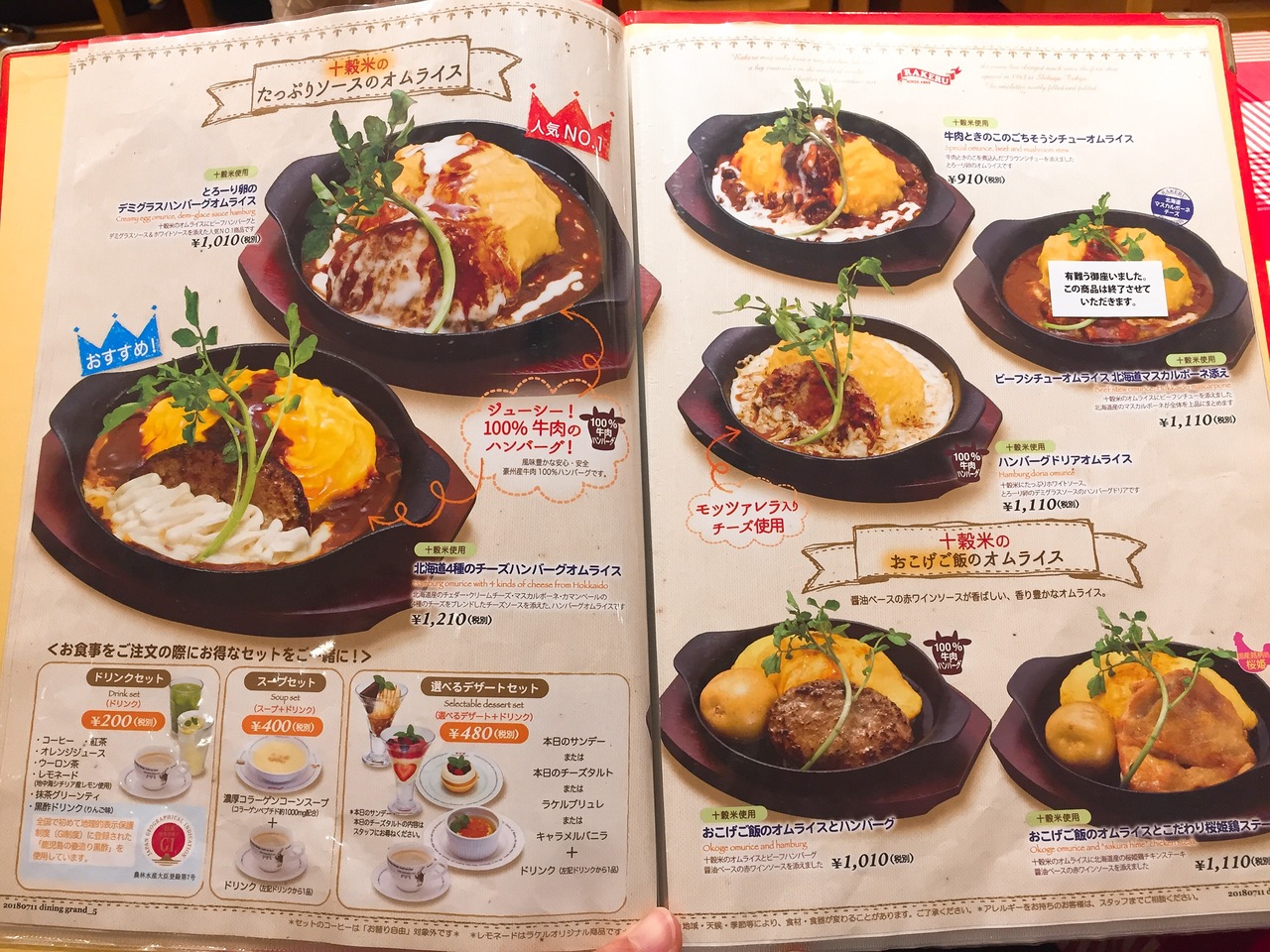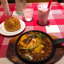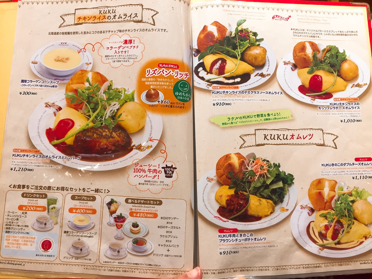 久しぶりのラケルにうきうき。 オムライスは色々な種類がありますが、中のご飯がカレーピラフのものもあります。 私は、十穀米のきのこシチューオムライスを注文。 濃厚で、具もゴロゴロ入ってて、鉄板にのって出てくるので冷めることもなく最後まで美味しく頂けました!