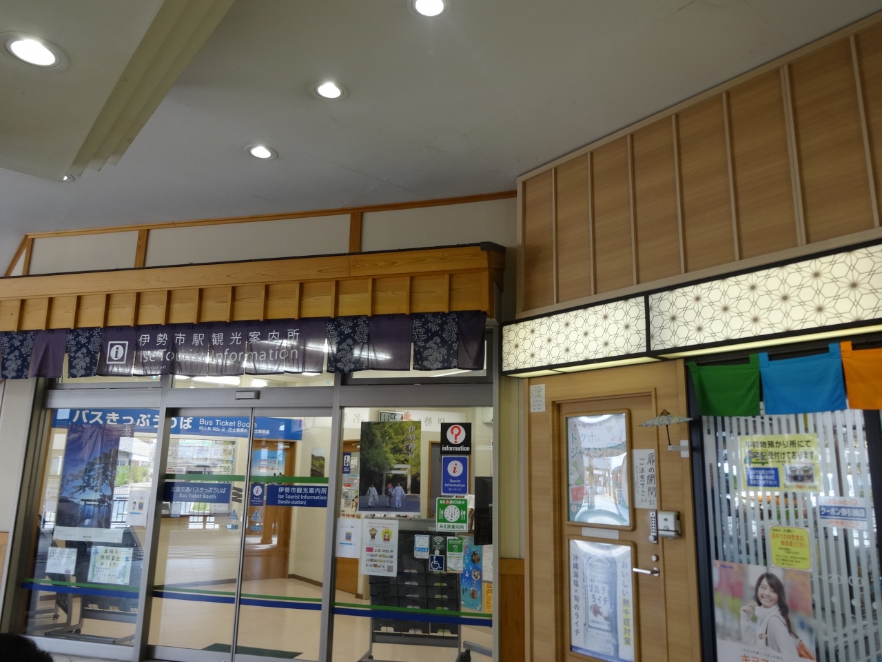 伊勢市駅(JR、近鉄)のJR側(外宮側)の改札を出て、すぐ右方向に案内所はありますので、外に出ることなく、パンフレット類が入手できます。但し、それほど広くはなく、またバスきっぷ売り場と同じ部屋ですから、一見観光案内所とは分かりにくいかもしれません。